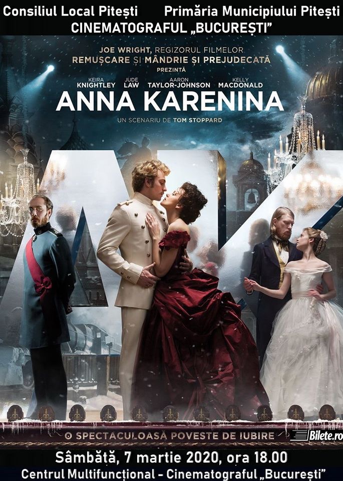 Sâmbătă, 7 martie 2020, de la ora 18.00, la Cinematograful de artă „București” va fi proiectat filmul „Anna Karenina”. Regia îi aparține lui Joe Wright, în rolurile principale jucând Keira Knightley, Aaron Taylor-Johnson și Jude Law. Filmul reprezintă o dramă.