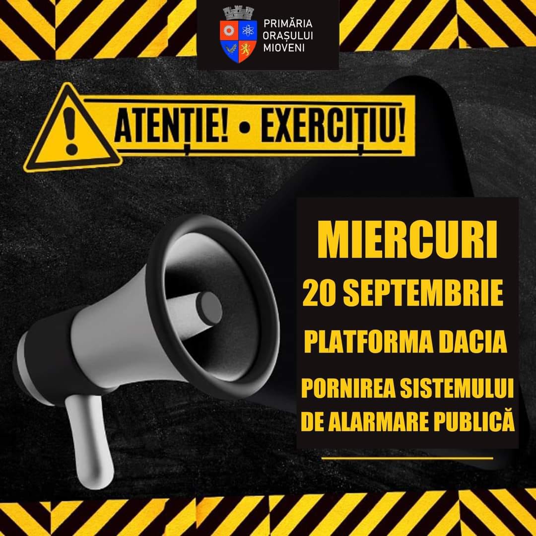 În această dimineață, în intervalul 09:00-11:00, SC AUTOMOBILE DACIA SA va acționa sistemul de alarmare centralizat la nivel de Platforma Mioveni, pentru verificarea funcționării corecte a sirenelor exterioare.