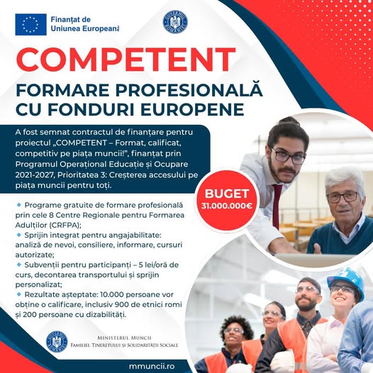 Ministerul Muncii, Familiei, Tineretului și Solidarității Sociale, prin Agenția Națională pentru Ocuparea Forței de Muncă (ANOFM), anunță semnarea contractului de finanțare pentru proiectul „COMPETENT – Format, calificat, competitiv pe piața muncii!”, finanțat prin Programul Operațional Educație și Ocupare 2021-2027, Prioritatea 3: Creșterea accesului pe piața muncii pentru toți.