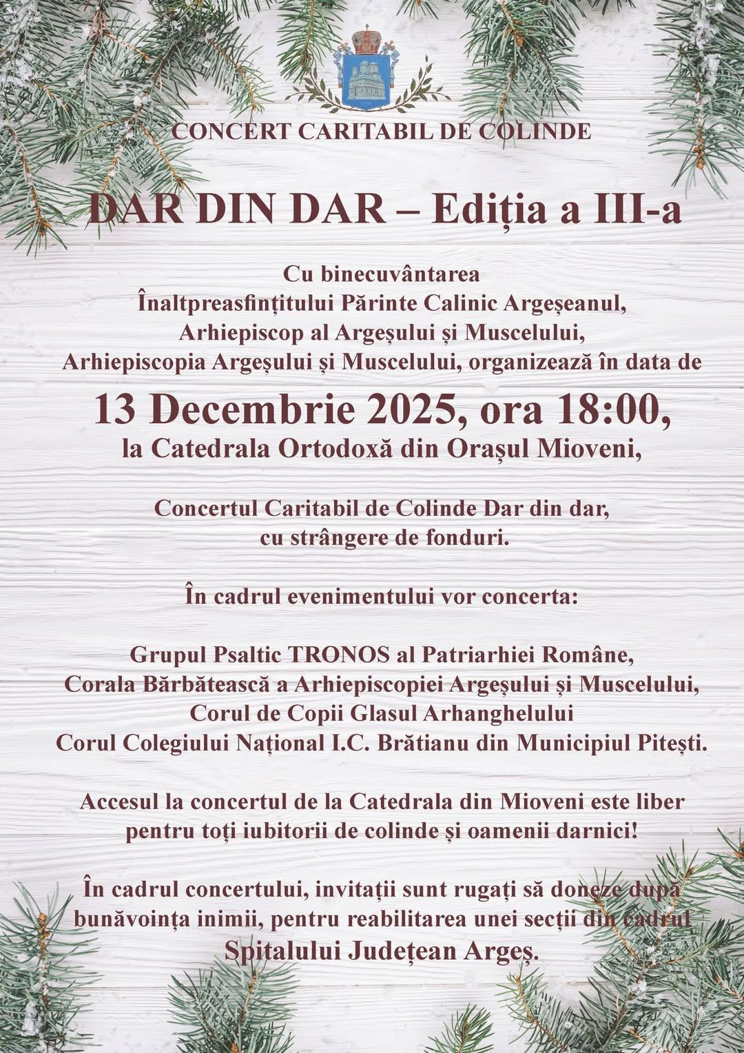 Concertul de Colinde „Dar din Dar”, aflat la a treia ediție, va avea loc la Catedrala Ortodoxă din Mioveni, începând cu ora 18:00.