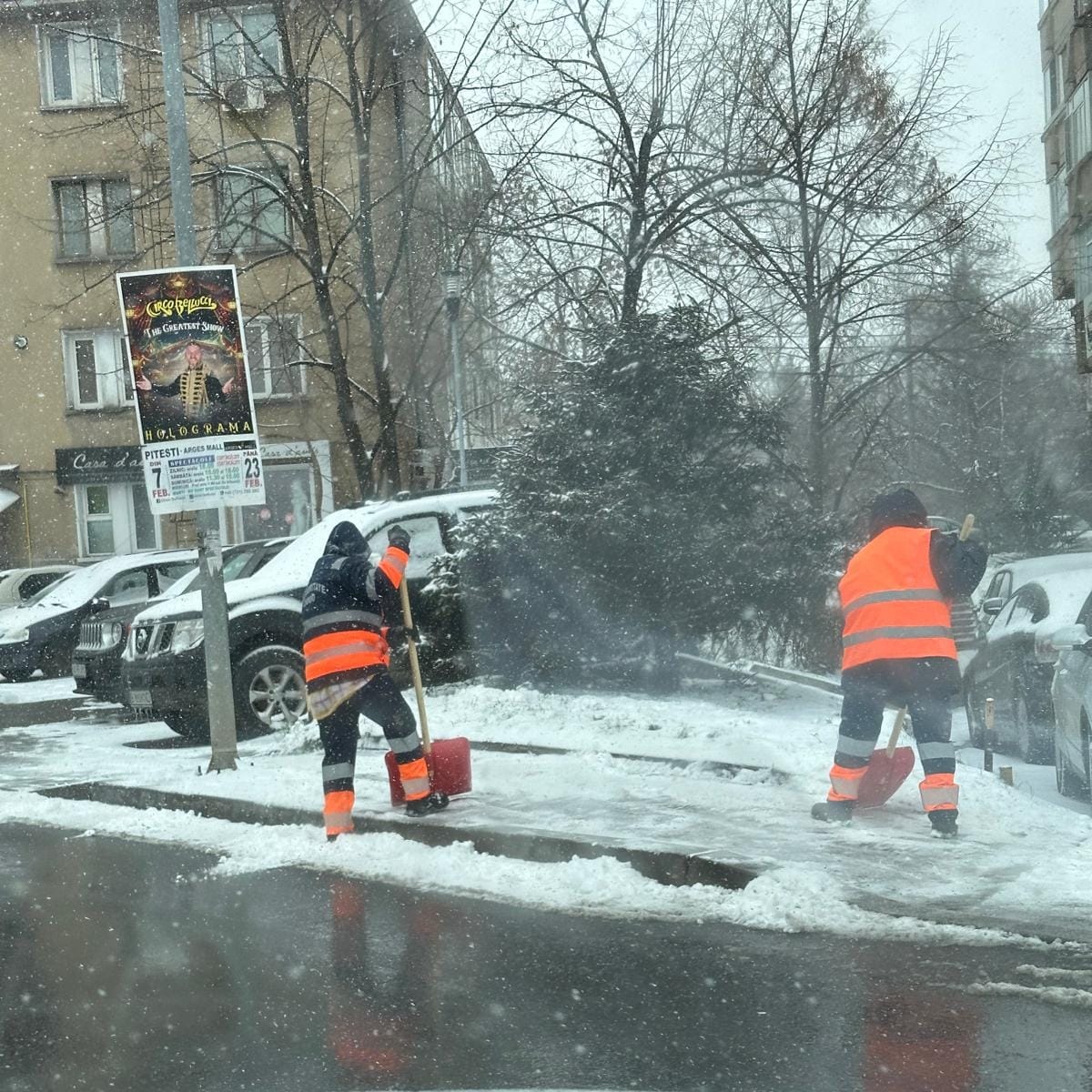 Schimbul de zi a preluat activitățile de deszăpezire. Menținem în stare practicabilă drumurile, curățăm trotuarele de pe arterele principale și secundare și degajăm stațiile de transport în comun.