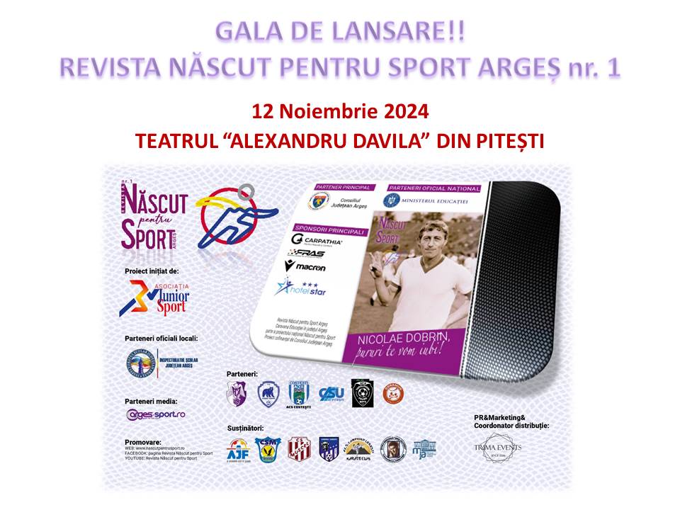 Marți, 12 noiembrie 2024, de la ora 17.00, la Teatrul “Al. Davila”, va avea loc evenimentul de lansare al primului număr al Revistei “Născut pentru Sport Argeș”.