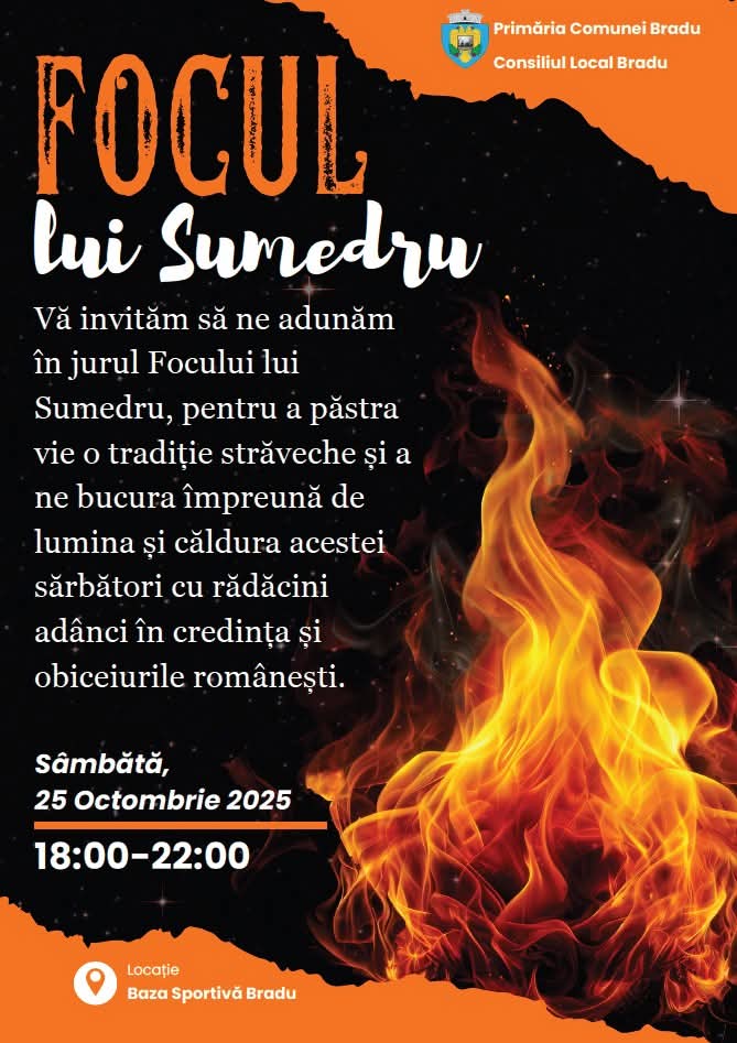 Sâmbătă, 25 octombrie 2025, între orele 18:00 și 22:00, locuitorii comunei Bradu sunt așteptați la Baza Sportivă pentru a celebra „Focul lui Sumedru”, un eveniment care reunește întreaga comunitate în jurul tradiției și bucuriei de toamnă.