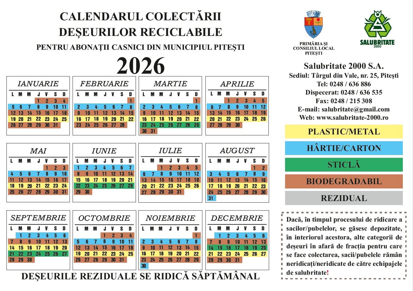 Salubritate 2000 S.A. aduce în atenția abonaților casnici din Pitești graficul de colectare a deșeurilor reciclabile, pe fracții separate, pentru anul 2026, conform calendarului atașat.