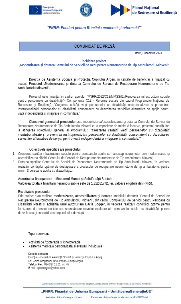 Prin proiect s-au realizat: modernizarea, accesibilizarea și dotarea imobilului denumit ”Centrul de Servicii de Recuperare Neuromotorie de Tip Ambulatoriu Mioveni”, din cadrul Complexului de Servicii pentru Persoane cu Dizabilități Pitești și achiziția unui autoturism Dacia Jogger, în vederea realizării condițiilor optime pentru furnizarea de servicii sociale corespunzătoare nevoilor evaluate ale persoanelor adulte cu dizabilități, pentru dezvoltarea și consolidarea deprinderilor de viață.