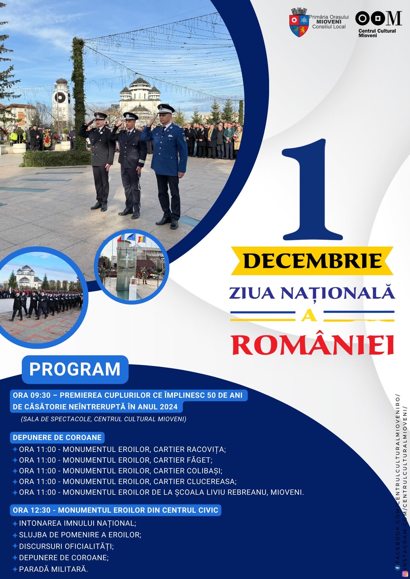Cu prilejul Zilei Naţionale a României, Centrul Cultural, Primăria orașului și Consiliul Local Mioveni invită cetățenii pe data de 1 Decembrie să se bucure de sărbătoarea tuturor românilor și să ia parte la manifestările oficiale organizate pentru marcarea acestui eveniment, cu profunde semnificaţii istorice.