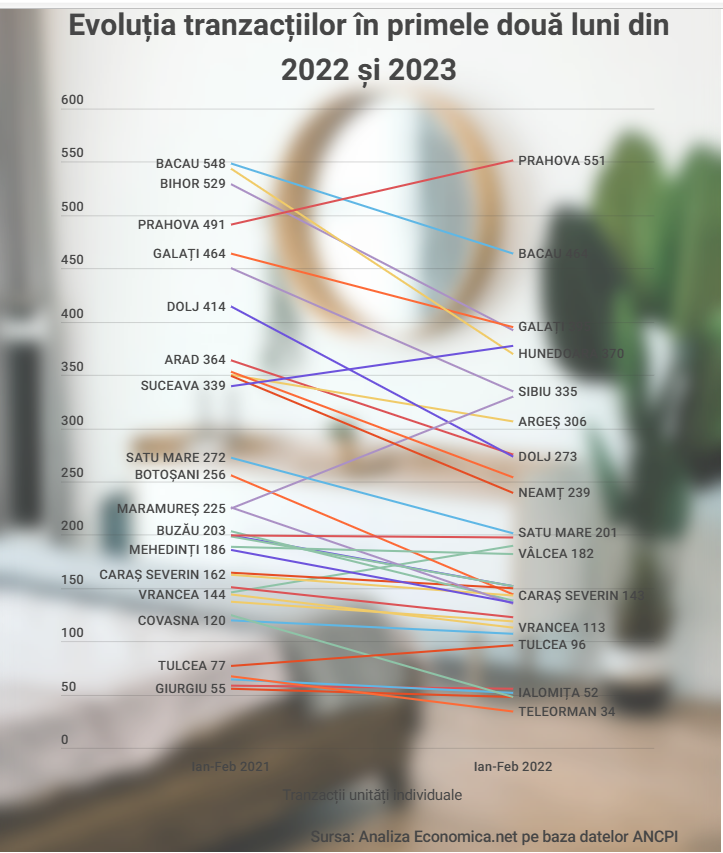 În județul Brașov s-au vândut anul acesta 1.328 de unități individuale, față de 1.444 în primele două luni din 2022. În Constanța s-au vândut 951 față de 1.637, iar în Cluj 1.005 față de 1.618 în ianuarie și februarie 2022.