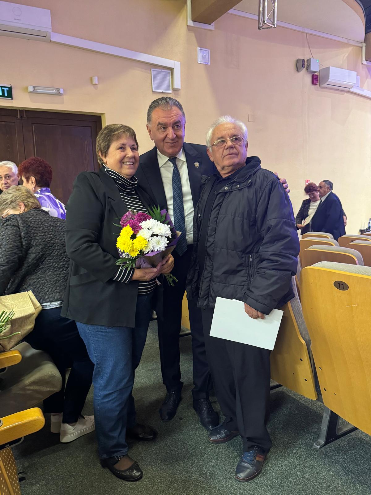 Primarul Cristian Gentea le-a oferit diplome de fidelitate, flori și premii în bani, în semn de prețuire pentru dragostea și echilibrul care i-au unit o viață întreagă.