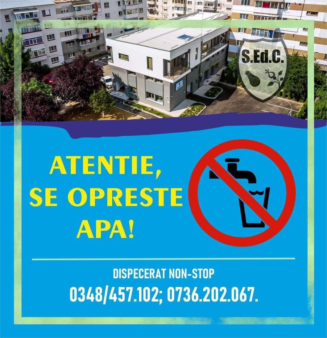 Consumatorii afectaţi de această oprire sunt rugați să-şi asigure rezerva minimă de apă pentru consum şi uz casnic pe perioada întreruperii furnizării apei.