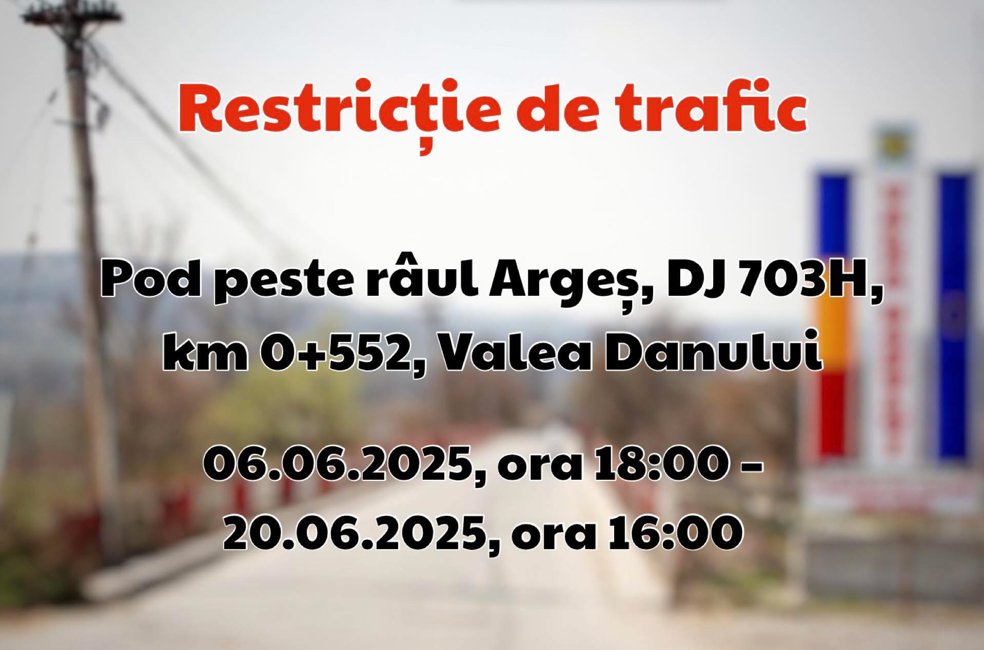 Regia Autonomă Județeană de Drumuri Argeș R.A., în calitate de administrator al drumurilor județene, informează participanții la trafic că se prelungeste închiderea circulației pe podul peste râul Argeș, de pe DJ 703H, km 0+552, Valea Danului, pentru intervalul 06.06.2025, ora 18:00 – 20.06.2025, ora 16:00.