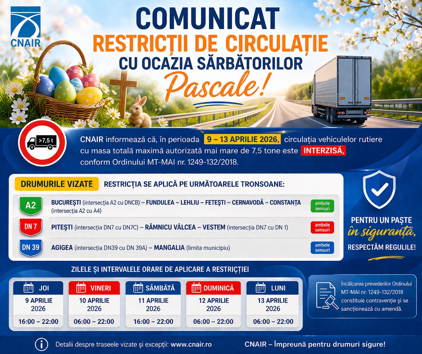 Șoferii de camioane trebuie să țină cont de noile restricții impuse în perioada Paștelui. CNAIR a anunțat că vehiculele mai mari de 7,5 tone nu vor putea circula pe anumite drumuri cheie între 9 și 13 aprilie 2026.