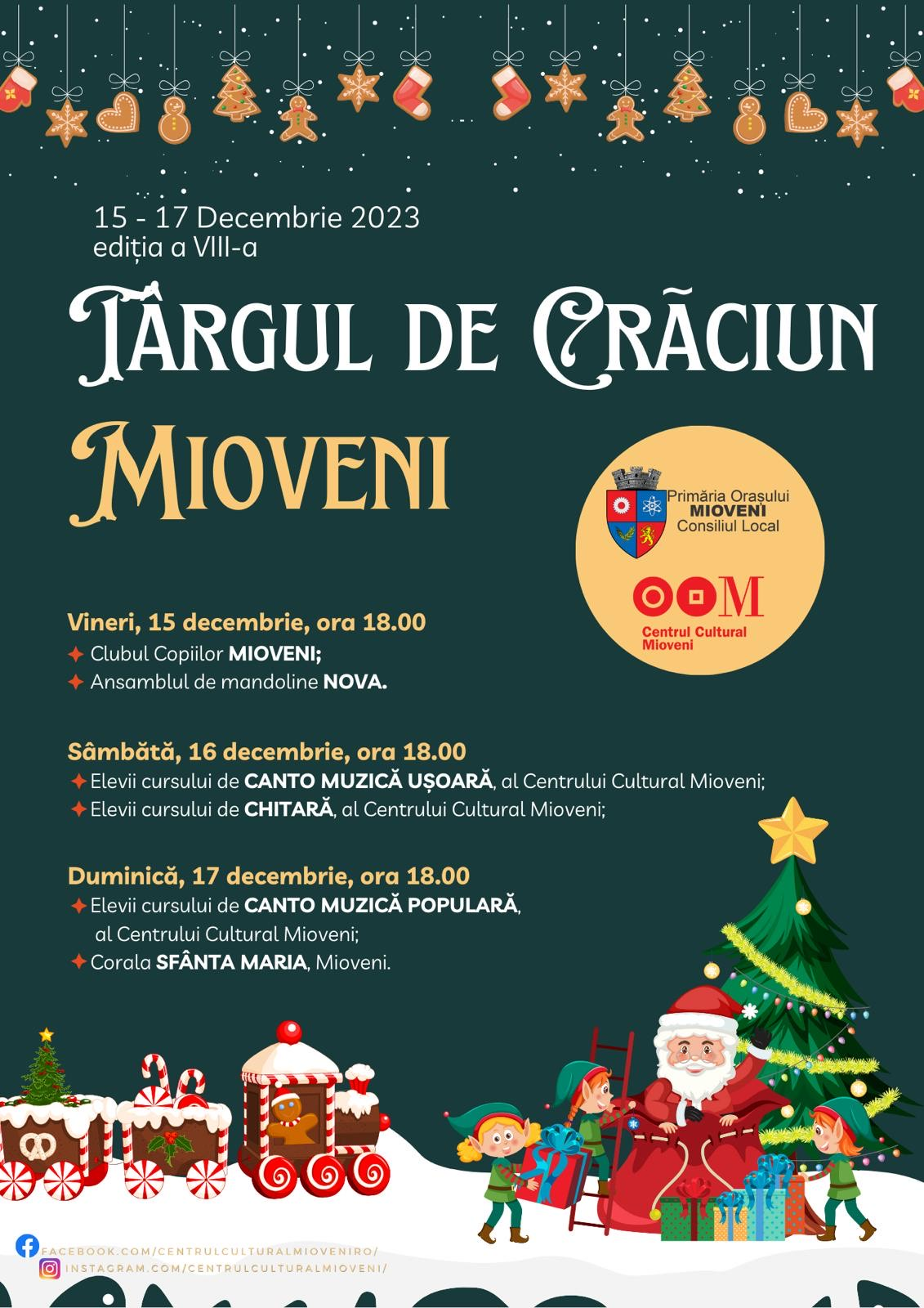 Devenit un eveniment de brand al orașului Mioveni, cea de-a opta ediție a Târgului de Crăciun de la Mioveni oferă publicului trei zile și trei seri de distracție cu muzică live, produse tradiționale, dulciuri cât cuprinde, vin fiert, multă lumină și culoare.