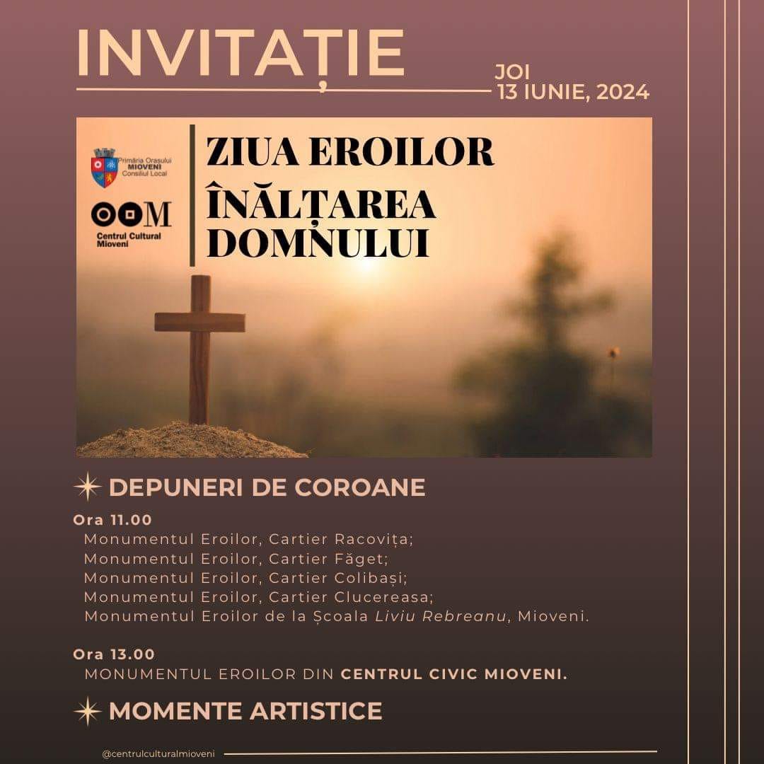 Joi, 13 iunie, Centrul Cultural și Primăria orașului Mioveni organizează Ziua Eroilor eveniment de comemorare a eroilor patriei căzuți în marile conflagrații mondiale, dar și în Războiul de Independență.
